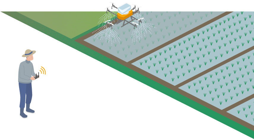 稲作作業における農薬散布に特化した小型ドローンを提供。防除作業の低コスト化・生産性向上・軽労化に寄与しています。無料での修理交換など、保証・サポート体制を整えています。